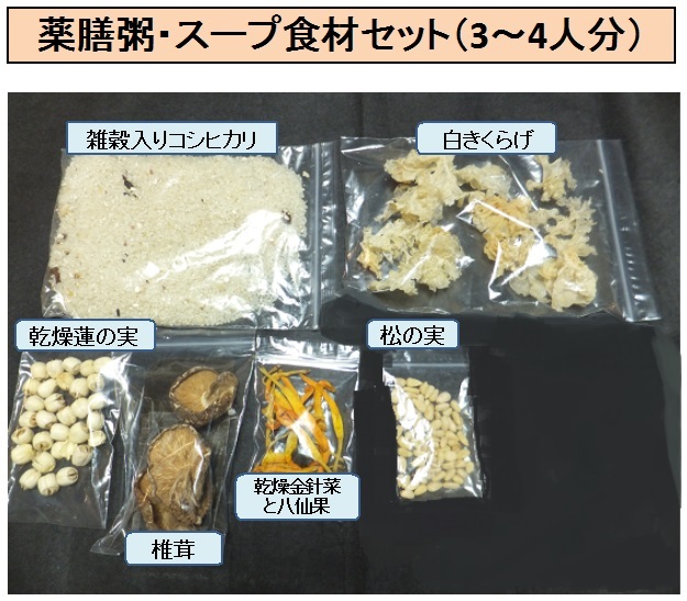 5.きんたろう倶楽部 理事長 鏡森定信(富山大学名誉教授、富山やくぜん普及推進会議 座長)監修の薬膳粥(やくぜんがゆ)の材料セット3人~4人前 「レシピ」と「材料の説明書き」 付き