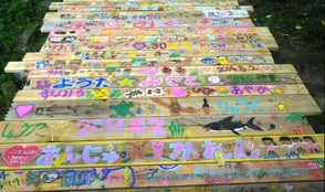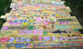 『さとやまの木道(こみち)』の資金は、おもに市民の皆様からの募金で賄っています。路面板1枚(道幅2m×15cm)に1,000円の募金をいただき、運営費の半分弱を賄っています。路面板には、各自が思い思いのイラストやメッセージを描き、木道の先端に自分で打付けて、木道を伸ばしています。