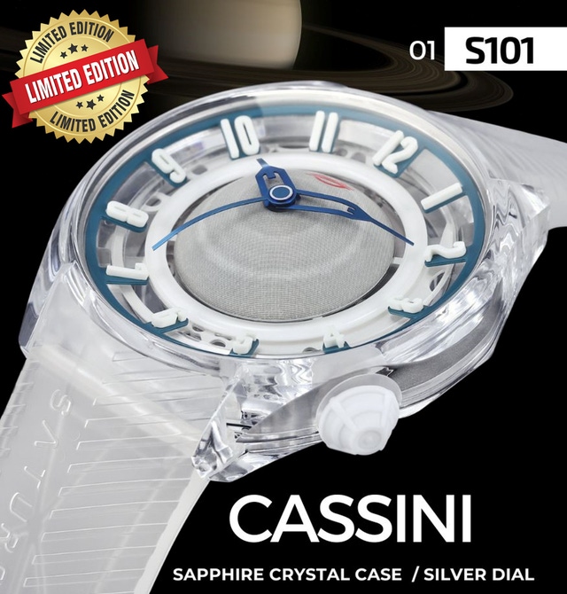 限定生産7個の"S101 CASSINI"は、希少素材で加工の難しいサファイアクリスタルをボディ全体に使用した特別仕様のモデルです。