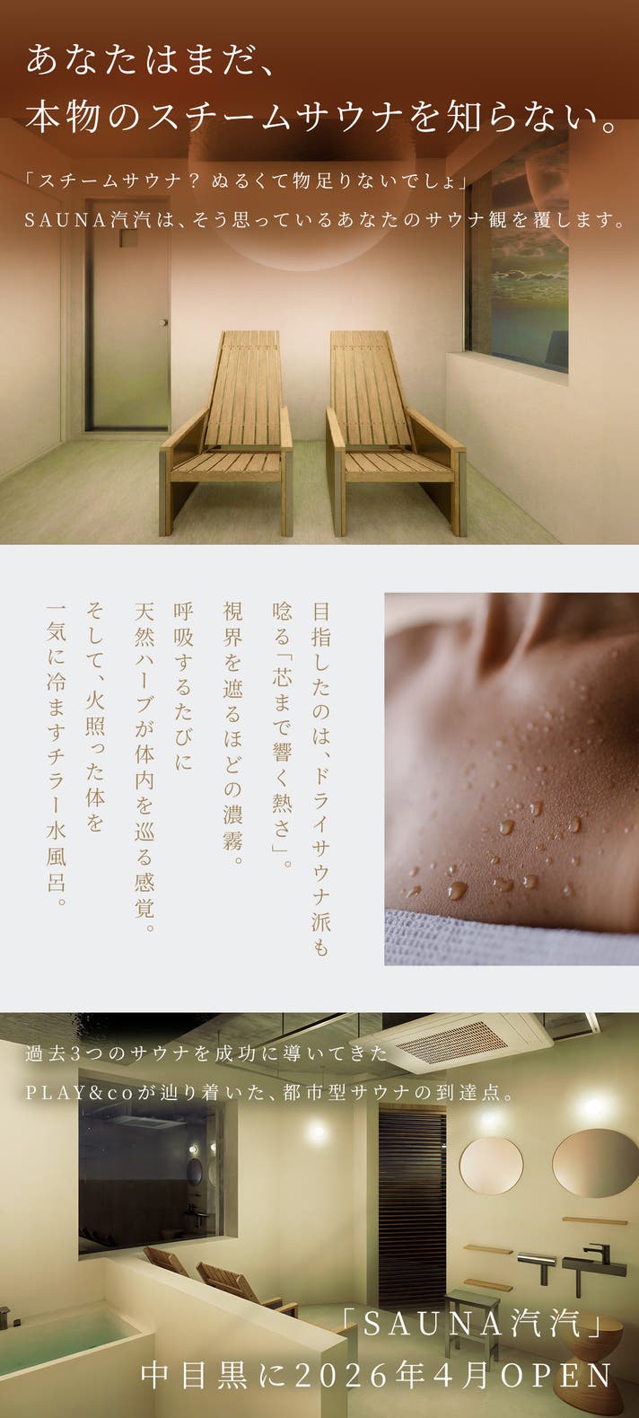 SAUNA汽汽は、PLAY&coが過去3つのサウナを立ち上げ、育て、磨き続けてきた末に辿り着いた、都市型プライベートサウナの到達点です。