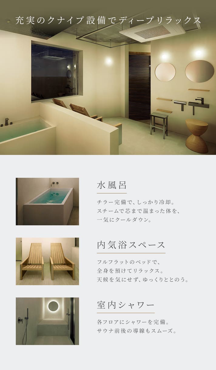 - チラー搭載水風呂やサウナ室内クナイプ設備も完備。浴びて洗えて、没入導線が完結。