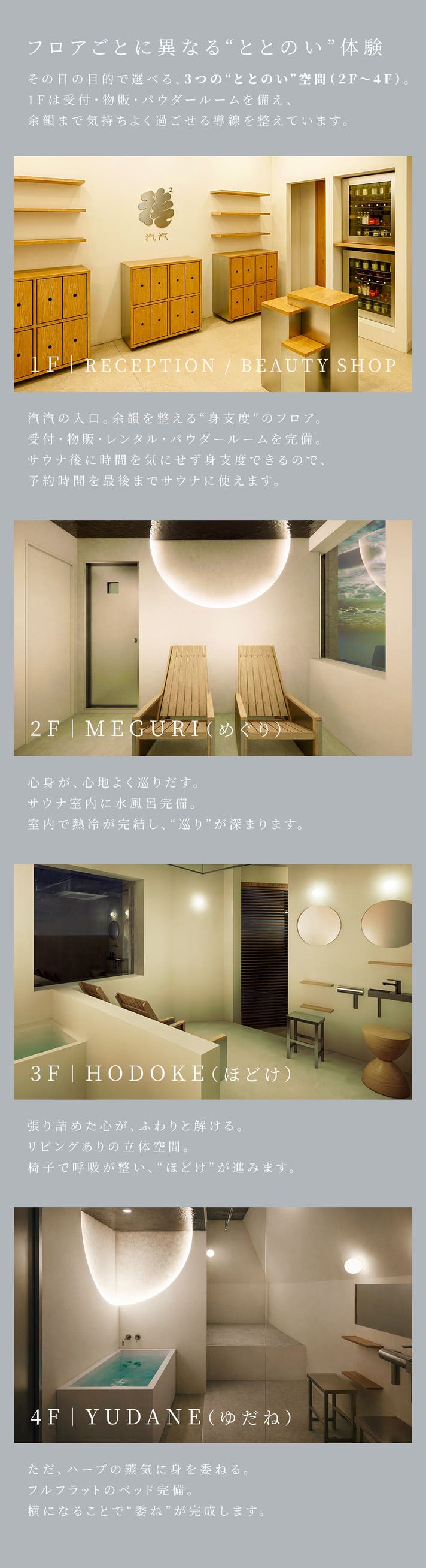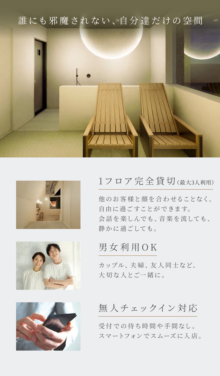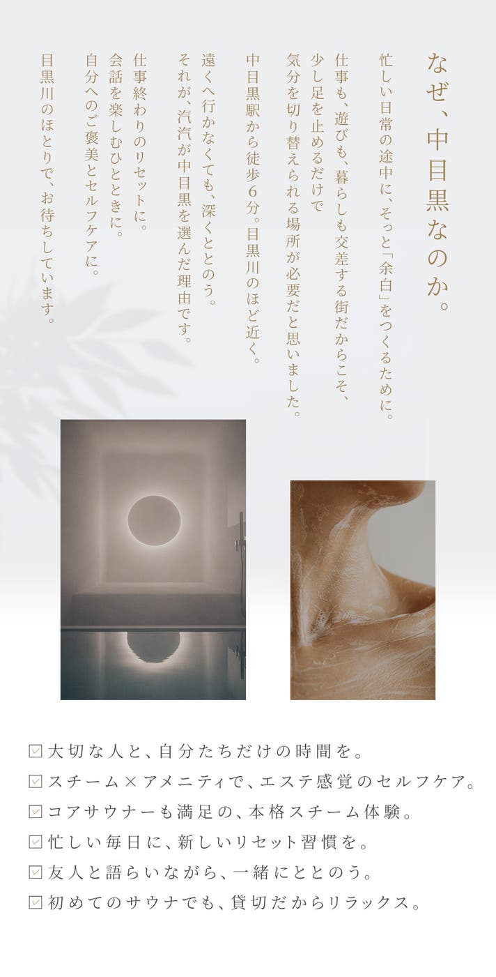 きめ細やかな蒸気が肌や髪に潤いを届け、ハーブの力も取り込みながら、美容・リセットにフォーカスした体験を実現しています。
