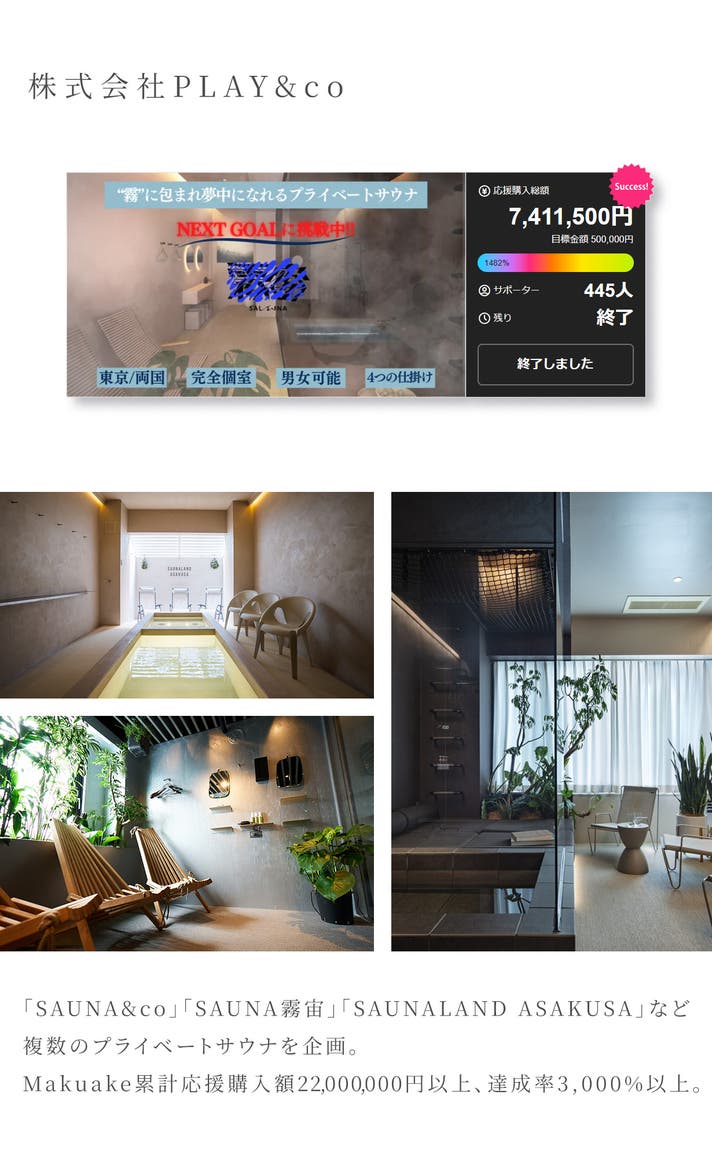 SAUNA&co、SAUNA霧宙、YUURO Bath-Living Hotel Ryogoku、SAUNALAND浅草などを経営。