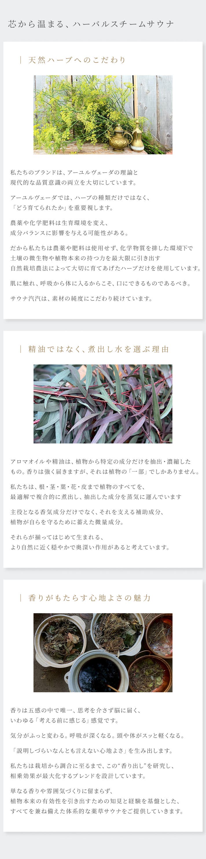 - 熱が深く入る、濃霧スチーム。精油ではなく、蒸した天然ハーブの煮出し水のみを使用。