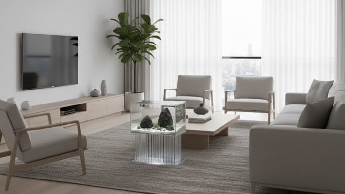 厚板アクリル板と、視界を遮るフレームをなくした設計が生む、圧倒的な透明感。水面のゆらぎと反射光が部屋の情報をやさしく中和し、10秒眺めるだけで、深い呼吸を取り戻せる。それは、あなたのための“動く静寂”です。