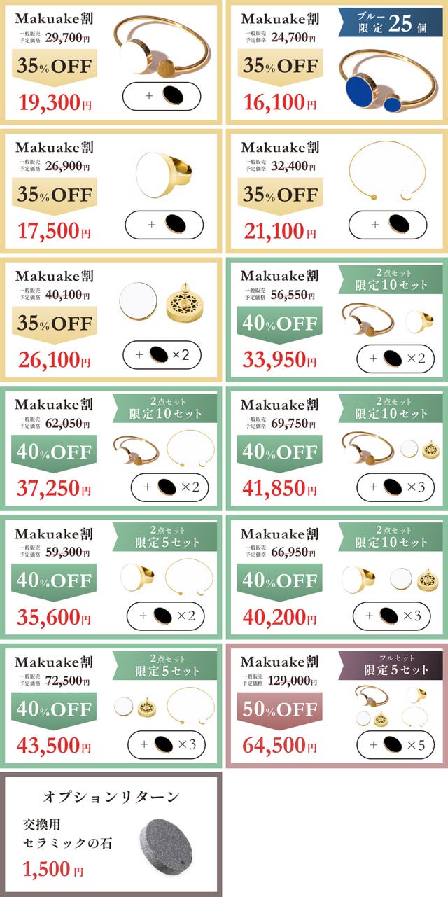 ・初期不良以外の返品・返金はお受け致しかねます。 ・香りは裏側から優しく香ります。強く香るわけではありませんので、ご注意ください。 ・モニターの色によって、色が違って見えることがあります。 ・水を扱う際は、フレグランスジュエリーにかからないようご注意ください。 ・カバーの紛失にはご対応致しかねます。 ・セラミックの石の紛失にはご対応致しかねます。 ・ピアスのキャッチの紛失にはご対応致しかねます。 ・リングの中のセラミックの石の音が気になる場合があります。その場合は、付属のクッションシートをご使用ください。 ・無理な力による変形の場合、返金・返品・交換のご対応致しかねます。 製造スケジュールについては、プロジェクト成功を想定した数で調整しておりますが、想定を上回る応援の申し込みがあった場合、製造や発送に伴うやむを得ない事情により、お届けが遅れる場合がございます。上記のようにプロジェクトページに記載している内容に変更がある場合は、活動レポートなどで共有を行っていく予定です。 並行輸入品が発生する可能性があります。正規以外での個人輸入等は、完全に防ぐことができない場合がございます旨、予めご了承のほどお願いいたします。 並行輸入品は正規代理店による製品保証を受けることができません。 また、正規代理店を通じて購入することで、日本国内での流通に必要な各種認証の取得や、関税の適切な処理が担保されます。 本文中に記載させていただいたスケジュールは、あくまでプロジェクト公開時点の予定です。応援購入の性質上、配送遅延のおそれがございます。 原則として、配送遅延に伴う応援購入のキャンセルはできませんが、リターン配送予定月から3ヵ月を超えた場合には、希望者に限りキャンセルにて対応させていただきます。