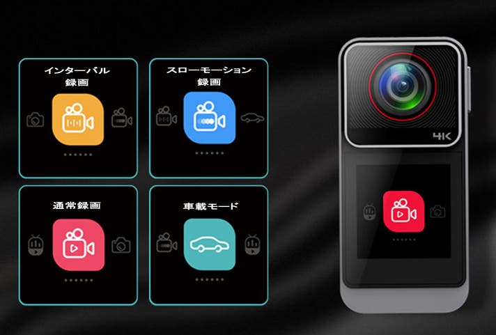 通常撮影、インターバル撮影、スローモーション、ドライブレコーダーの4つの撮影モードを搭載。様々なシーンや用途に応じて最適なモードを選択でき、クリエイティブな映像表現が可能です。