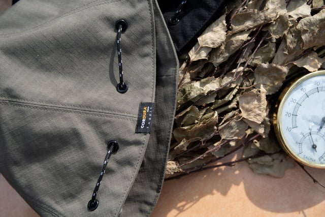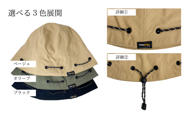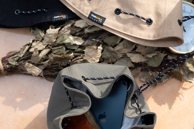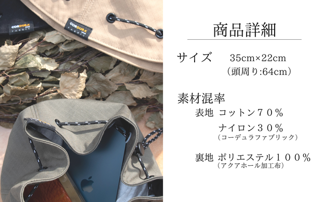 表地はコーデュラ®を採用!サウナハットを衛生的に保つために何度洗っても型崩れしにくく、耐久性に優れており、洗いをかけるごとにビンテージ感が増すような生地を採用しています。アウトドアなシーンにもハマるデザインになっております。