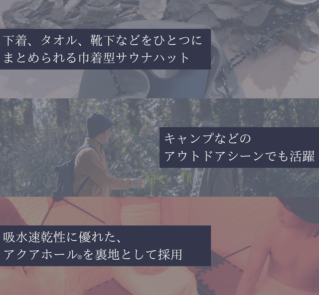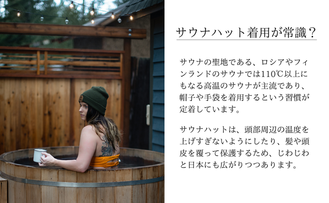 サウナ人口は増え続けており、それに比例しサウナハットの認知度も拡大しつつあります。ネットでは色々なサウナハットが販売されておりますが、サウナのみでしか使用ができず少し勿体ないかと感じました。