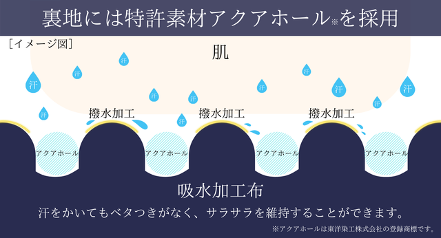このアクアホールですが、凹凸のある生地を使用し、凹面に撥水加工を施し、凸面に吸水加工を施した特殊加工です。
