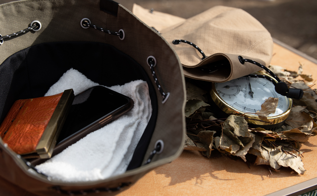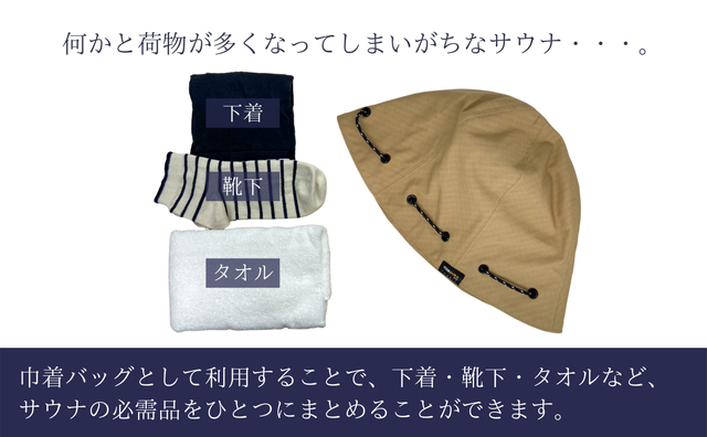 そんな小物類をひとまとめにできるよう、サウナーの必須アイテムであるサウナハットを巾着バックとしても使えるような仕様にしております。