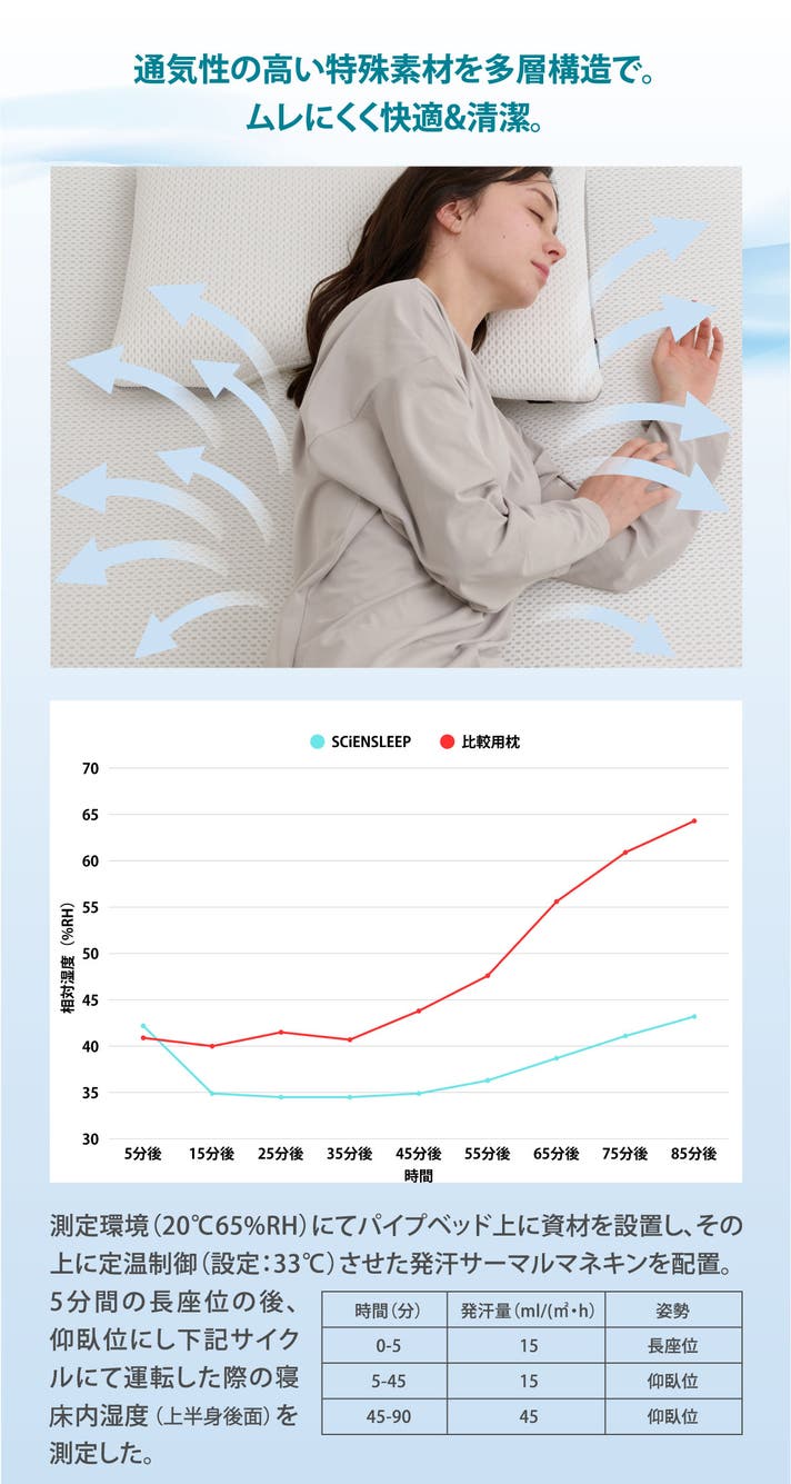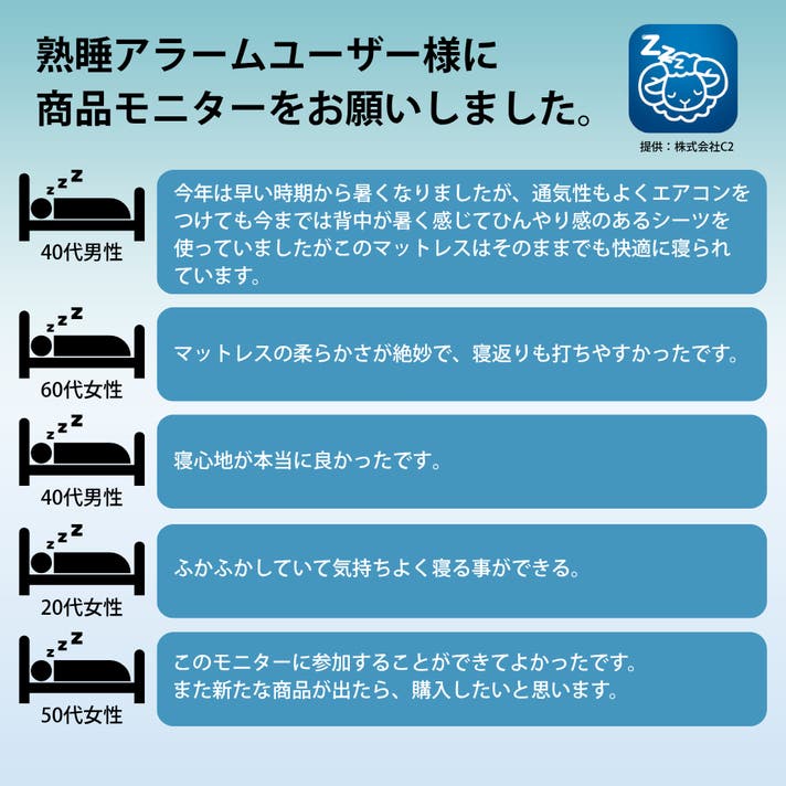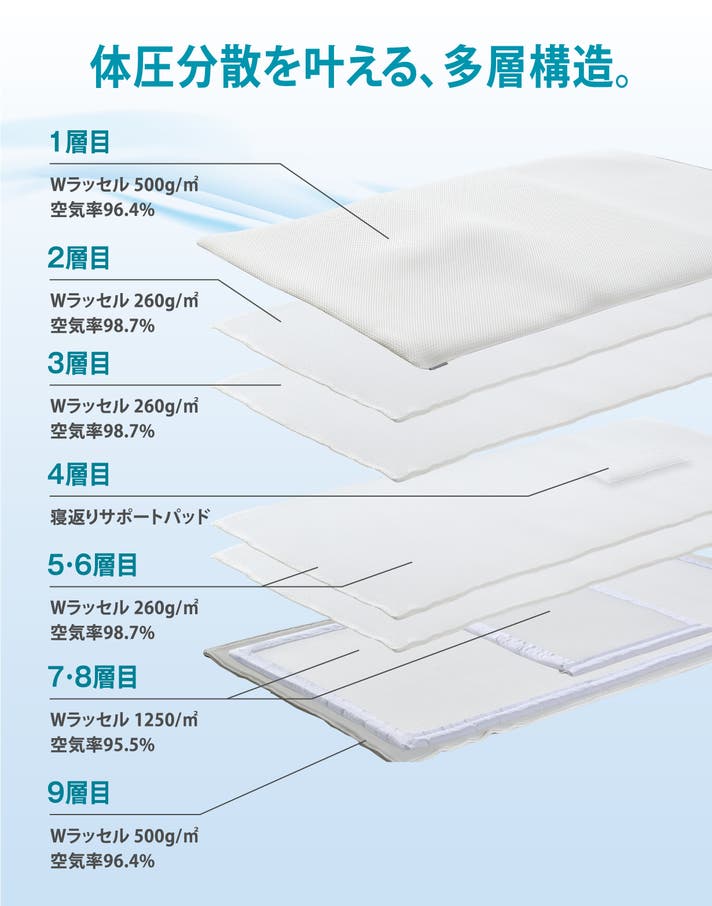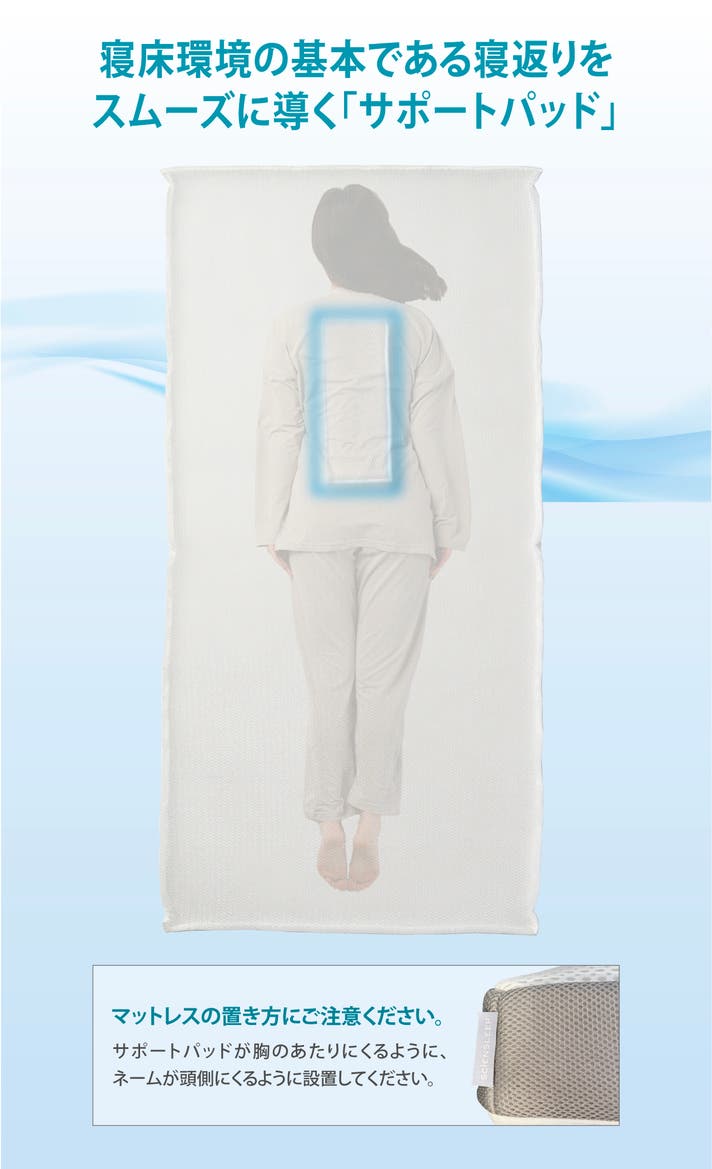 - 質の高い睡眠環境に不可欠な「体圧分散」「寝返りのしやすさ」「清潔さ」を高次元で実現。