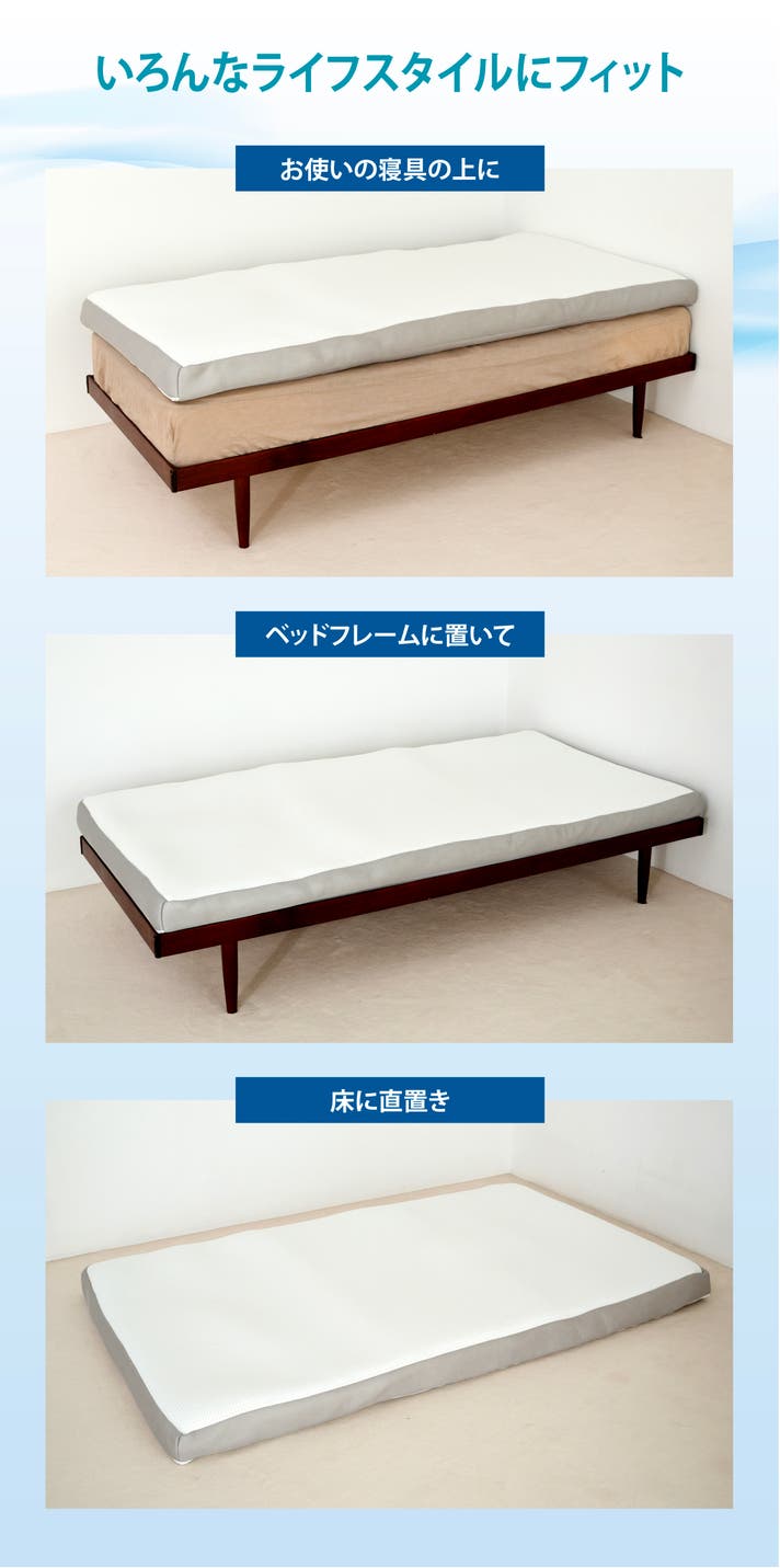 A. はい。今お使いの寝具の上に重ねての使用や、フローリングへの直接敷き、ベッドフレームへの直置きなど、さまざまなスタイルに対応しています。