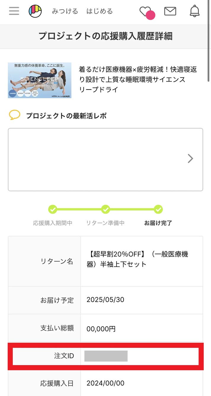 A. Makuakeマイページ>プロジェクトの応援購入履歴>注文IDからご確認いただけます。詳細な手順は以下のmakuakeヘルプをご覧ください。