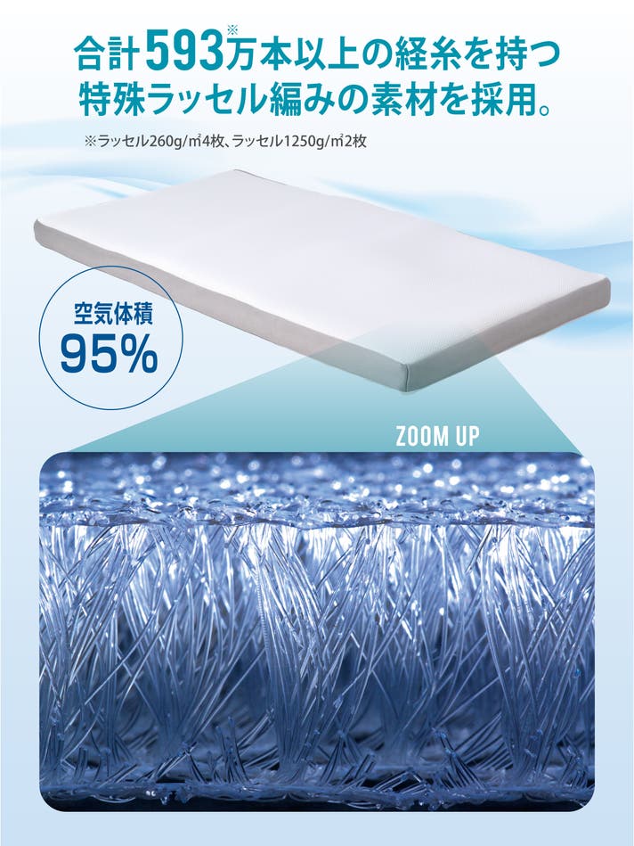 空気体積比率95%の空気層と、593万以上の経糸(たていと)を持つため、