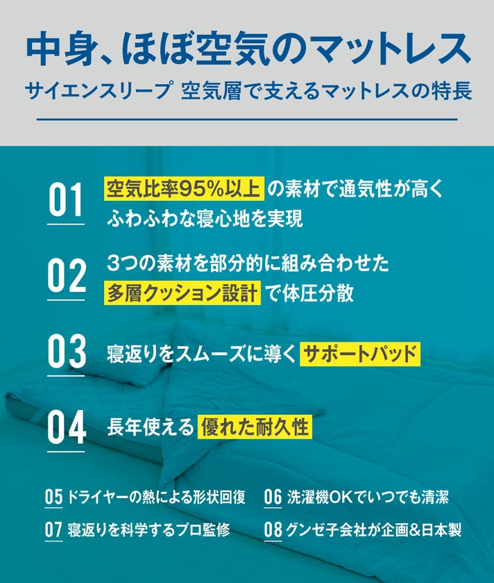 1986年の創業以来、どこまでも誠実な心「至誠」を大切に、心地よさを追求してきたGUNZE。そのDNAを100%受け継いでいるSEESAYが快適な睡眠環境をサポートする寝具を開発。睡眠にしっかりと向き合い、「サイエンスリープ 空気層で支えるマットレス」を生み出しました。