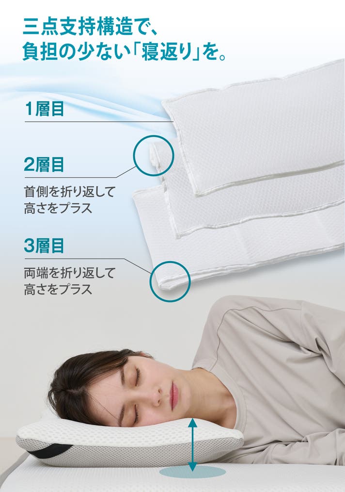 横寝時の肩や首まわりの負担をやわらげ、自然な寝返りをスムーズにサポートします。