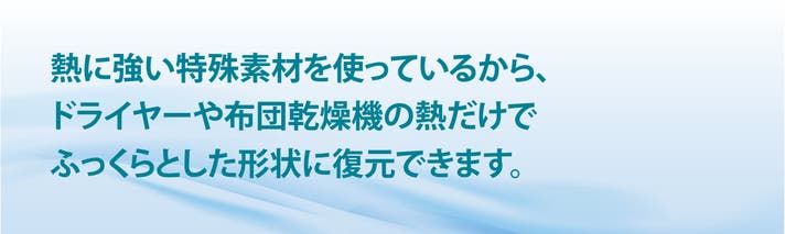 A. はい、使用可能です。本製品は熱に強い特殊素材を採用しており、ドライヤーや布団乾燥機の温風で“ふっくら”と形状を回復できます。ただし、高温での長時間使用や、重量物を乗せたままの乾燥はお避けください。