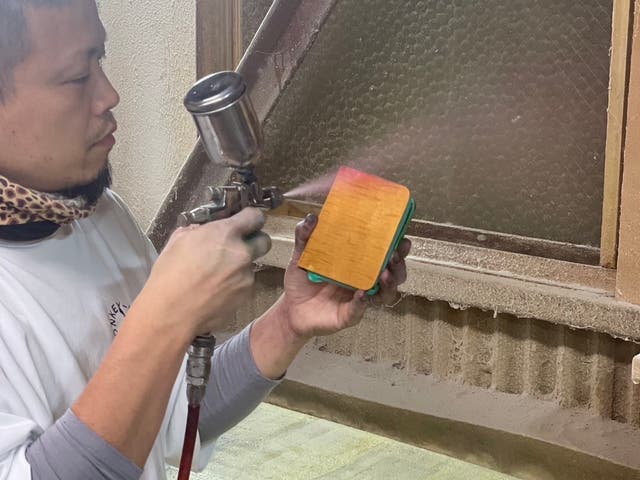 scivaの染色工程には、手で染色する作業と、色を吹きつけて染色する2つの塗り方があります。