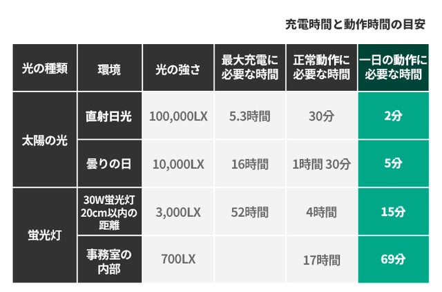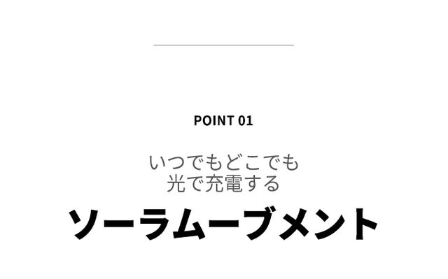 ソーラームーブメントは、時計の針を動作させるために太陽光や小さな光を電気に変えて、残りの電気は二次電池に蓄えて使用します。バッテリーの電池残量が無くならないよう定期的に光を当てていただくことで、動作が停止することなくご使用いただけます。(フル充電後、光が当たらない場所で約90日間動作いたします。)