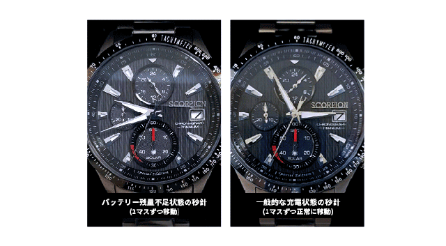 バッテリー残量が不足していると、秒針は2秒づつ動いてお知らせします。(2秒運針)