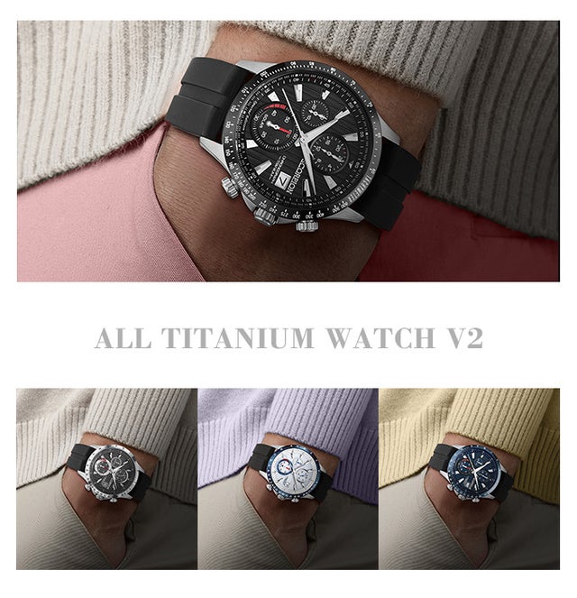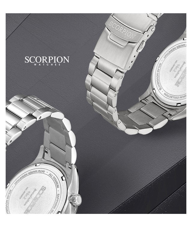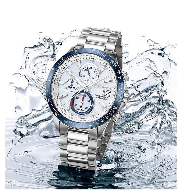 スコーピオンオールチタンソーラーウォッチ V2は、同じ強度のステンレススチール製腕時計のほぼ半分の重量で、非常に軽くて快適に着用できます。