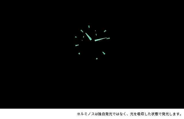 分針、時針、文字盤には、十分な光を吸収した場合に暗闇で光るルミノスを搭載しています。夜間や明かりのない屋内などでも時間の確認が容易です。