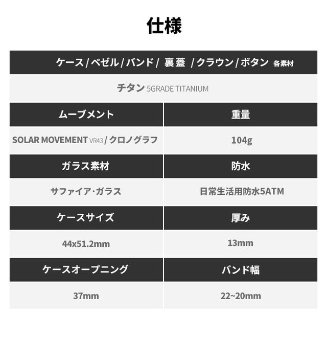 スコーピオンオールチタンソーラーウォッチ V2は、ベゼル、ケース、裏蓋、バンド、バックルといった、外観を構成する全ての要素にチタンが使われている腕時計です。一般的な腕時計に使用されているステンレスと比べて、とても軽量です。