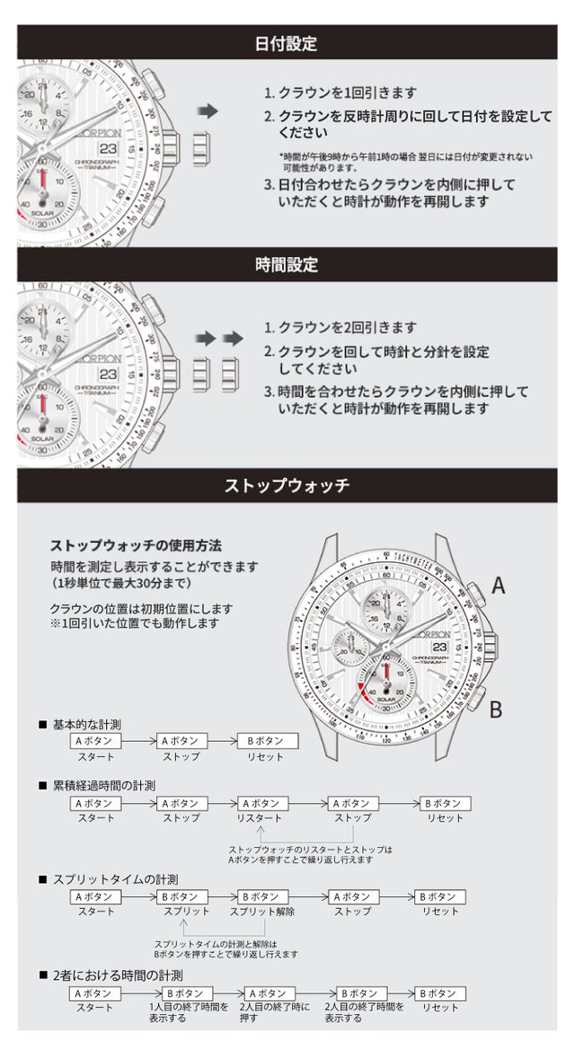 A:紙の取扱説明書は同梱されませんが、オンライン上で提供させていただく予定です。製品にURLとQRコードを記した紙を同梱させていただきます。尚、時刻調整と日付調整、及びストップウォッチのご使用方法につきましては、当プロジェクトページ内の【操作方法】でもご参照いただけます。