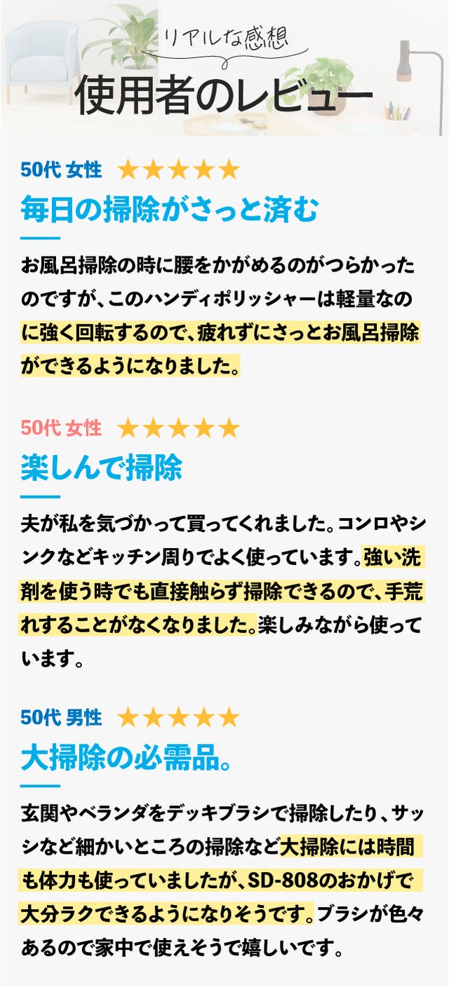 ハンディーながら、掃除するところに強く押し付けても回転数が落ちにくい強力なポリッシャーです。