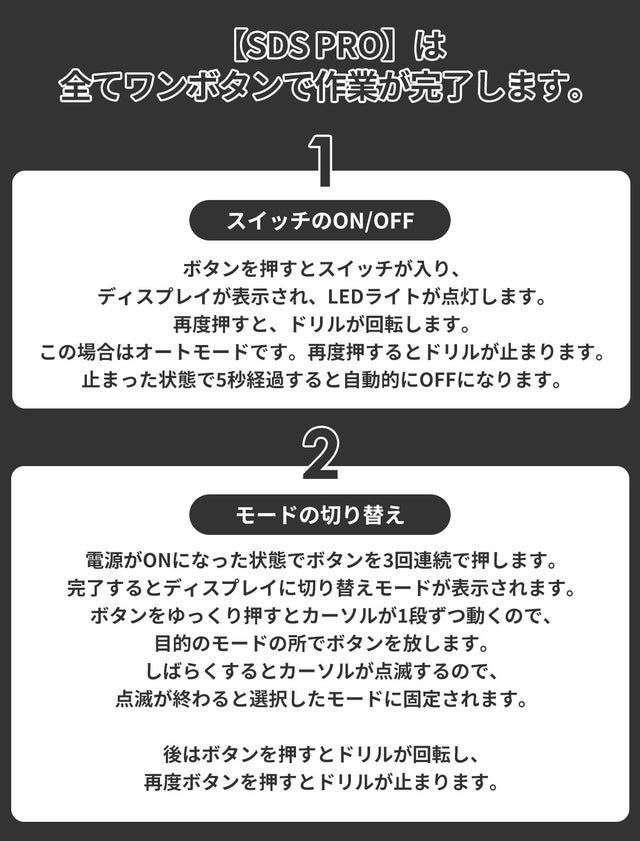 今回のプロジェクトでは【SDS PRO】以外に、液晶モニターとオードモードが無く、一般的な電動ドリルのように手軽に使える一回り小さな【SDS MINI】もご用意。
