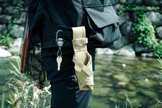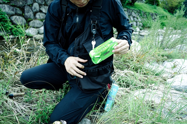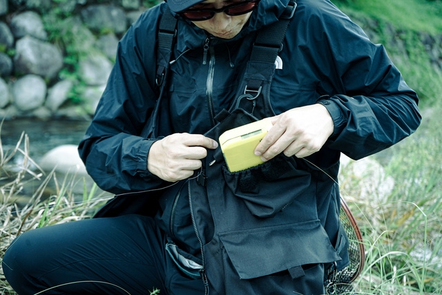 また、歩いたり、しゃがんだりと釣りにおいて様々な動きでポケットからケースが落ちないように入り口にはゴムとマジックテープの仕様にしています。