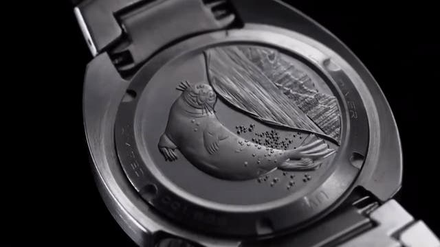 裏蓋にはSEAL DIVERのメインモチーフであるアザラシと、南極の棚氷のレリーフが彫られています。