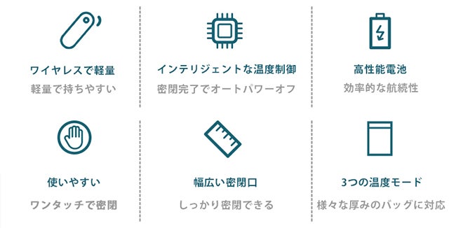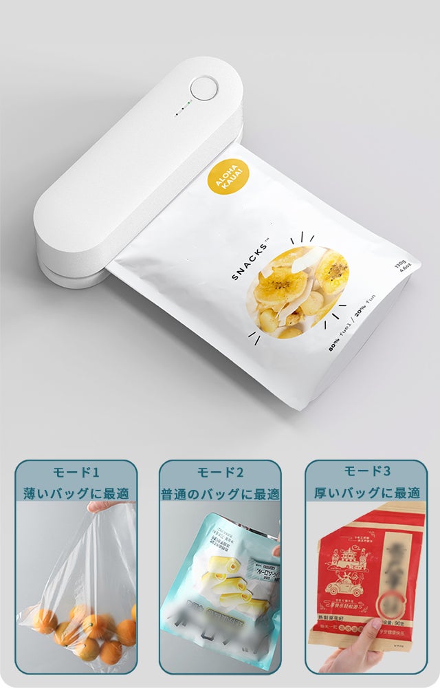 Sealie(シーライ)は、ワンタッチですぐに封閉でき、操作が簡単で、使いやすい手持ち充電式の小型シーラーです!わずかの200gで、持ちやすい。AIインテリジェントな温度制御と、60秒で自動オフの機能がついています。発熱線の長さが100mmで、密閉口の幅が2.0mmで、通常のシーラーより省エネで効率的です。