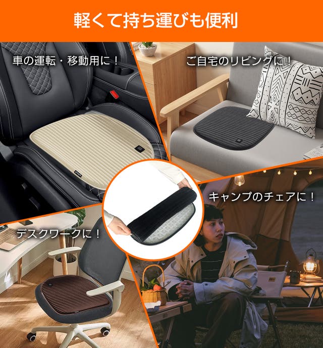 オフィスチェアや椅子はもちろんのこと、車のシートや、車椅子、ソファの上、また、座布団としての使用も可能です。気付きにくいお尻の冷えを優しく暖めてくれます。