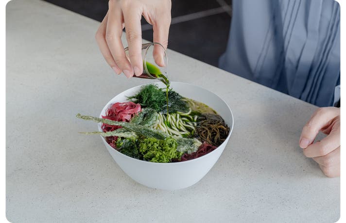 「海藻が主役の料理をむしゃむしゃ食べてほしい」──そんな想いから生まれた、シーベジタブル特製の海藻ラーメン。5種類の海藻が色鮮やかに盛られた一杯を口にすると、海藻ごとの香りと旨味の深みが広がります。ヘルシーでありながら、食べごたえもしっかり。最後の一滴まで、海のエキスが詰まっています。さらに、自社のテストキッチンチームが独自に開発した“魔法のアオサオイル”をひとたらし。海藻の旨味が濃縮されたこのオイルが、味に立体感と驚きを添えてくれます。