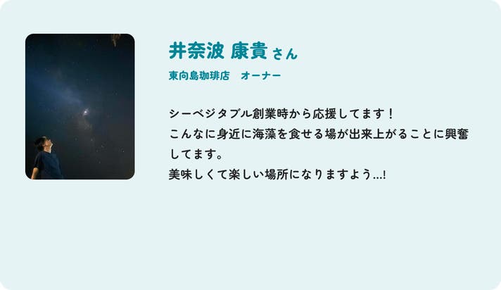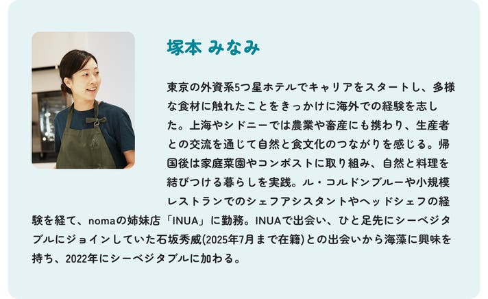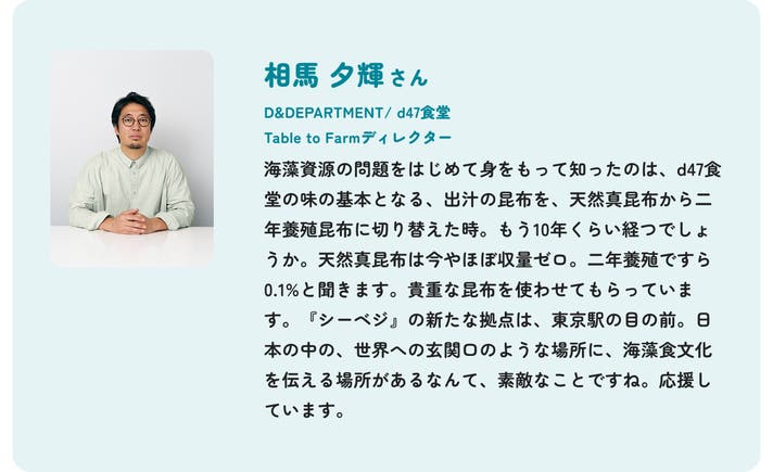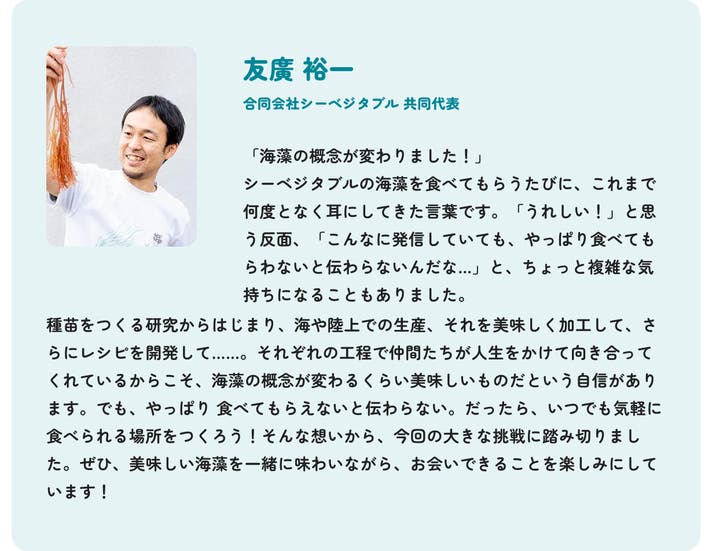 シーベジタブルが目指すのは、海藻を起点に、食・地域・文化を再編集すること。海藻を育てる人、料理する人、味わう人がつながり、食の最前線のプレイヤーと生産現場が交わることで、新しい海藻文化を育てていきます。現在、多様な企業やクリエイターとの実験的なコラボレーションが進行中。美味しく食べることを通じて、新たな出会いや発見があふれるようなお店にしたいと思っています。