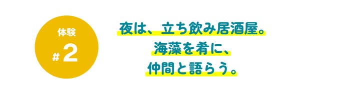 旬の海藻を使った肴とお酒で、語らいが生まれる立ち飲みスタイル。「すじ青のりかけすぎフライドポテト」、すじ青のりをフレッシュなストラッラャテッラチーズと共に閉じ込めた香りと味わい豊かな特別な「すじ青のりブッラータチーズ」、季節ごとの海藻プレート、シーベジサラダなど、海藻の意外な一面に出会える料理が並びます。 海藻の香りを感じながら、軽く一杯。食のつくり手、八重洲で働くオフィスワーカー、外国人観光客──さまざまな人が集まり、夜ごとに新しい出会いが生まれる“寄り合いの場”を育てます。