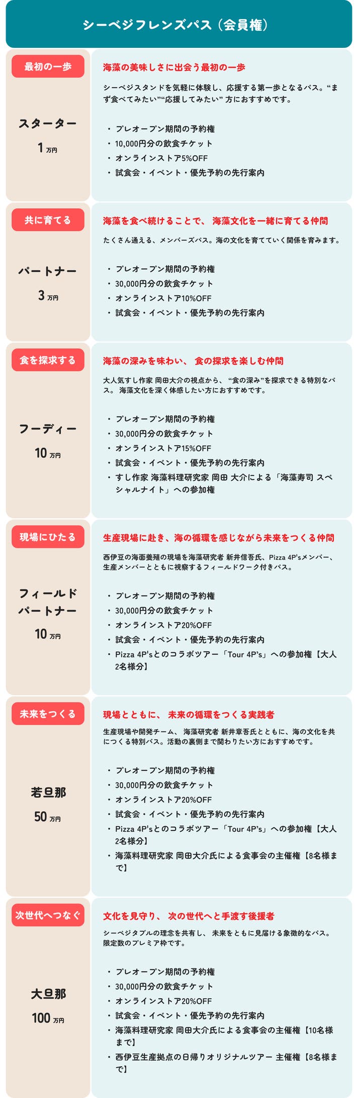 PIzza 4P’sメンバー、生産メンバー、海藻研究者 新井章吾氏とともに、海の文化を共につくる特別パス。シーベジタブルの裏側まで関わりたい方におすすめです。