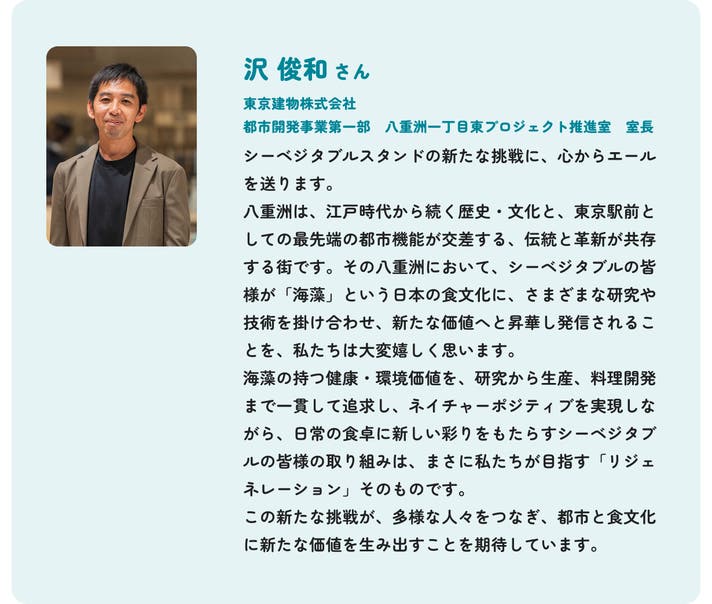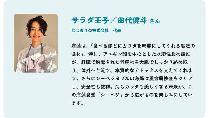 シーベジスタンドで提供する海藻料理は、人気すし職人であり現在はベストセラーを生み出す“すし作家・海藻料理研究家”として活躍する岡田大介氏が監修。これまでの日々の実験と探求の中で生み出してきた300以上のレシピをもとに、ジャンルを超えた海藻料理を提供します。さらに、季節ごとに新しく生まれるレシピやコラボ企業と試作された料理も随時メニューに反映。食べながら、シーベジタブルの最前線を感じられる場所となります。