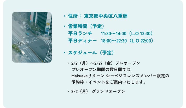 ※「プレオープン期間の予約権」は2026/2/2(月)~2/27(金)に1回のみ可能です。席予約のみで、当日の飲食には別途料金が発生します。ご予約方法の詳細は、2026年1月末までにMakuakeメッセージ機能にてご連絡させていただきます。