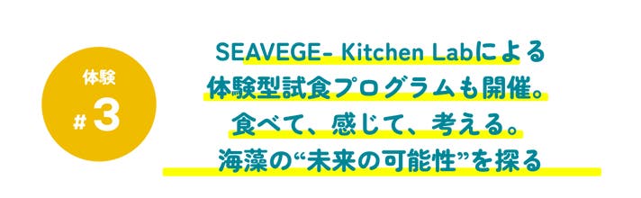 シーベジスタンドの2Fには、「SEAVEGE- Kitchen Lab」を開設。塚本みなみを中心に、海藻の調理や加工面での研究開発を行いながら、「Open Kitchen」という体験型試食プログラムも開催します。