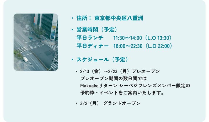 ※「プレオープン期間の予約権」は1回のみ可能です。席予約のみで、当日の飲食には別途料金が発生します。ご予約方法の詳細は、2026年1月末までにMakuakeメッセージ機能にてご連絡させていただきます。