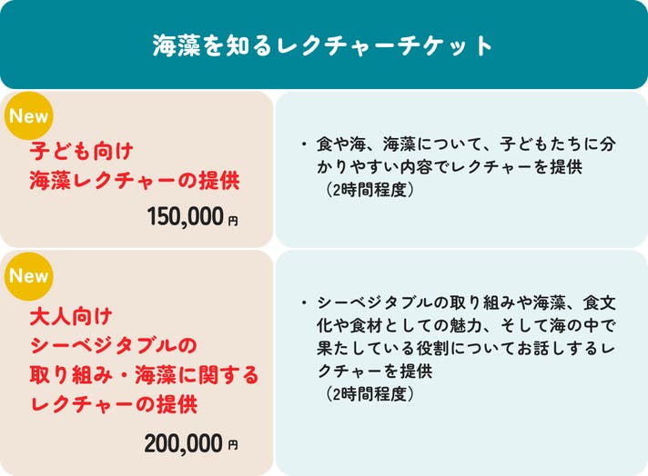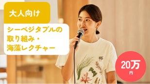 ■ 大人向け シーベジタブルの取り組み・海藻に関するレクチャーの提供 日々、海藻の栽培や研究、食材としての活用に向き合っているシーベジタブルのメンバーが現地へ伺い、海藻や私たちの取り組み、食文化や食材としての魅力、そして海の中で果たしている役割についてお話しするレクチャーを提供します。 レクチャーは、 学校や地域活動、企業研修、イベントなど、ご購入いただいた方のご要望や参加者に応じて内容を組み立てます。