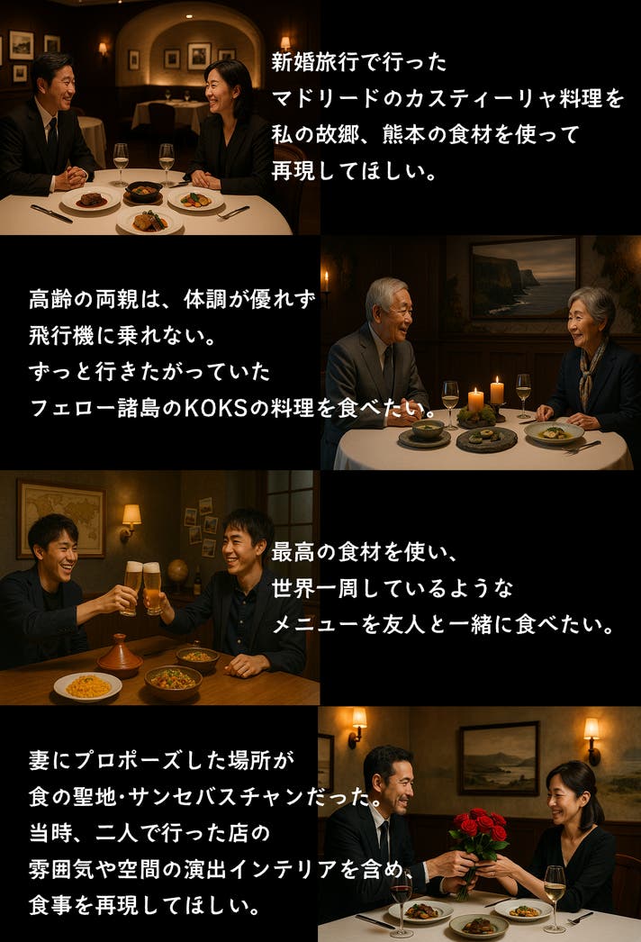 - 一日一組、人生の至福のひとときをディナーを天才シェフがあなたの為だけに作ります。