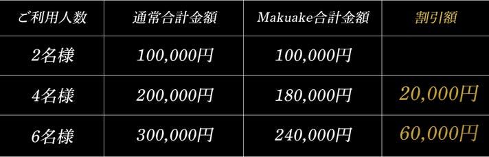 - マクアケから今回特別に30組限定で募集!ご利用人数が多いほどお得なプランをご用意しました。