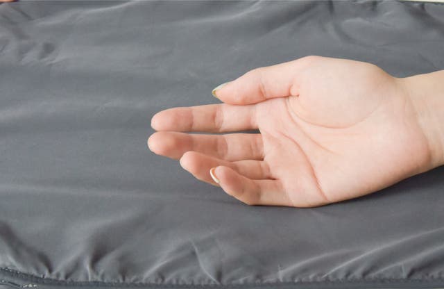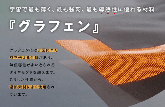 生地は綿でできており、肌触りが良いため、ごわついたり、蒸れる心配もなし。ストレスなく着ることができます。また、グラフェンという非常に強度な素材でできているため、折りたたんでも断線しにくい構造になっています。