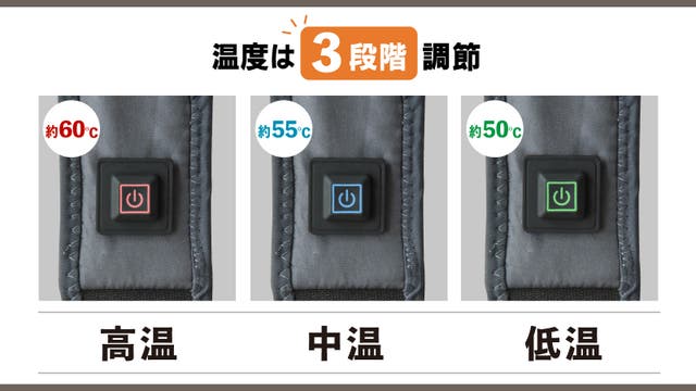 シークレットウォーマーは、着用時の温度を三段階で調整可能。【赤:高温(約60℃)青:中温(約55℃)緑:低温(約50℃)】の順序で切り替わりボタン1つでお好みの温度を調節できます。使用シーンに合わせて、急な気温変化にも状況に応じて対応ができます。