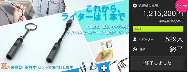 前作であるコンパクト加熱式ライターは、おかげさまで529名の方から1,215,220円の応援購入を頂きました!