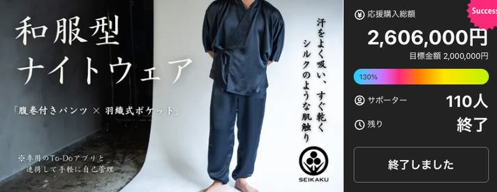 まず、第一弾プロジェクトである和服型ナイトウェアの応募購入をくださった全ての皆様に、この場を借りて心より感謝申し上げます。皆様の温かいご応援のおかげで、前回のプロジェクトは目標を大きく上回る【応援購入総額260万円】を達成し、【110人】ものサポーターの皆様にご愛用いただくことができました。